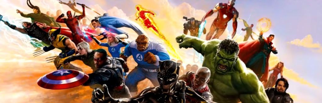 A arte inclui nomes já esperados, como Pantera Negra, Quarteto Fantástico, Capitão América (Sam Wilson) e Loki, todos peças fundamentais da nova fase do MCU. O impacto maior, porém, vem da presença de personagens que teoricamente não deveriam estar ali.